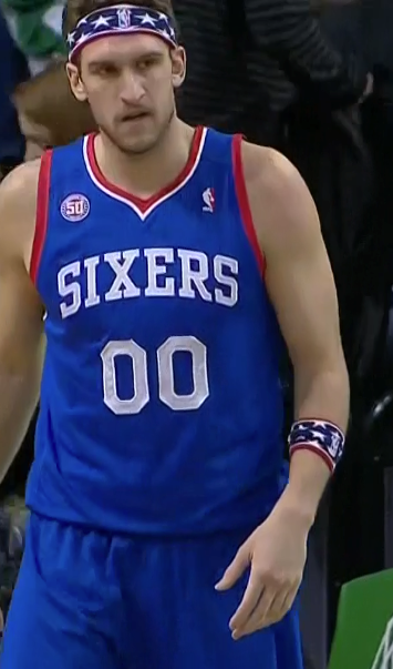 Given my pink post a couple weeks back, you probably can guess how I feel about "honoring" the veterans by playing stars and stripes dress up for Veterans' Day. No thanks, NBA. There has to be a better way to pay tribute (if it's even necessary at all). On a related note, though, I'd love it if Spencer Hawes wore those sweatbands all the time just because I think it's a good look for him, even if it's not especially supportive of veterans.