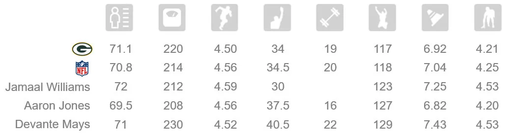 The Packers went against type with two of their three picks. Both Jamaal Williams and Devante Mays are more or less in line with the general physical profile of past Packers draft picks, but they don’t match the previous agility benchmarks.