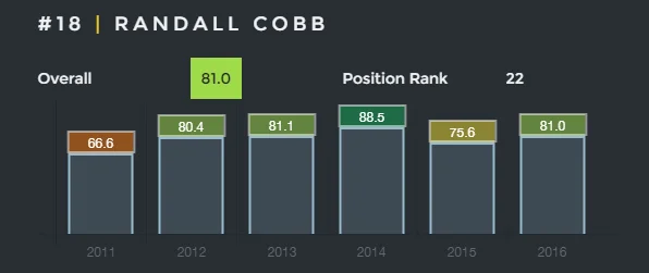 Pro Football Focus graded Cobb as a high quality receiver in 2014, an average receiver in 2015 and above average in 2016. His raw numbers this year are among the worst of his career. His 60 catches are the lowest he’s had in any full season other than his rookie year, as are his four touchdowns.